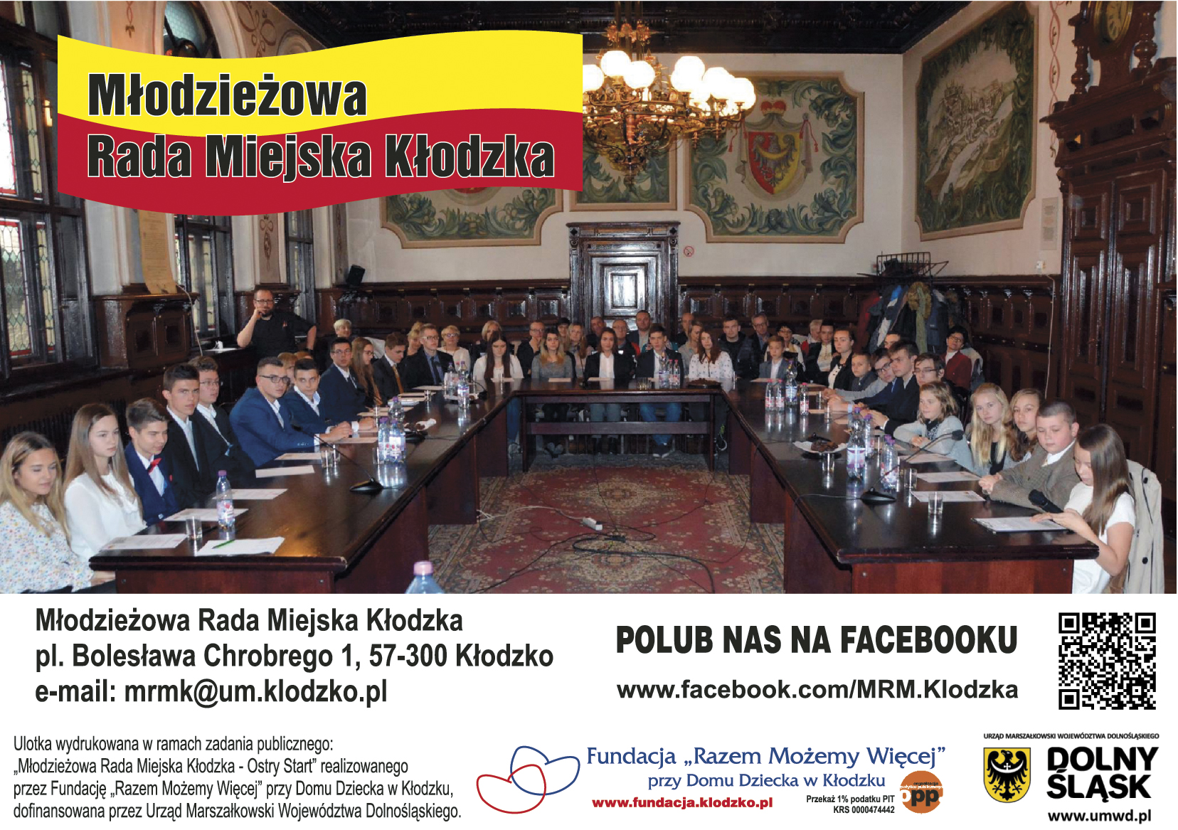Zadanie publiczne: „Młodzieżowa Rada Miejska Kłodzka – Ostry Start” - dofinansowane przez Urząd Marszałkowski Województwa Dolnośląskiego. W ramach zadania w ramach warsztatów przeszkolono 33 nowo wybranych młodych radnych Kłodzka. W każdej z 10 szkół powieszono tablicę korkową, na której prezentowane są działania MRMK. O powstaniu Młodzieżowej Rady Miejskiej Kłodzka informuje mieszkańców Kłodzka ulotka wydana w nakładzie 5000 egz. Termin realizacji: 4.10.2017 – 31.12.2017. Koszt zadania: 2701,34 zł. Dotacja: 2500,00 zł. Rozliczono w terminie.