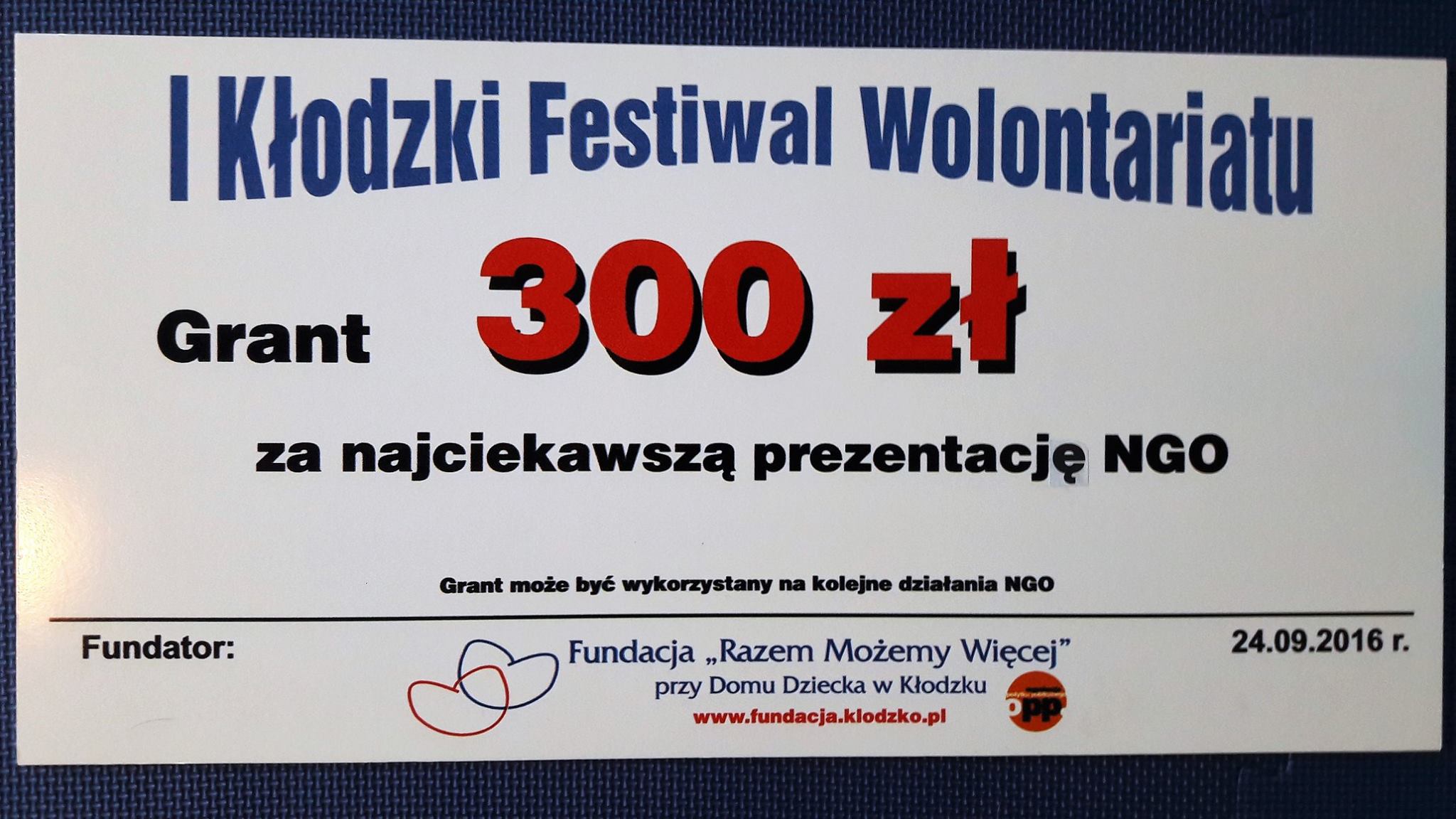 I Kłodzki Festiwal Wolontariatu zorganizowany przez Fundację „Razem Możemy Więcej” przy Domu Dziecka w Kłodzku przy współorganizacji Kłodzkiego Centrum Kultury Sportu i Rekreacji oraz Starostwa Powiatowego był okazją do zaprezentowania się organizacji pozarządowych. Te, które zdecydowały się wziąć udział w imprezie, stanowią trzon aktywnych NGO. Każda wystawiająca się organizacja miała okazje zaprezentować się na scenie. Najciekawiej wypadło Stowarzyszenie Sztuk Walki „Harmonia Qi”, które poza udostępnieniem namiotu wystawienniczego, prezentowało pokazy i treningi. Organizatorzy nagrodzili Stowarzyszenie przekazując grant w wysokości 300 zł na kolejne działania organizacji.