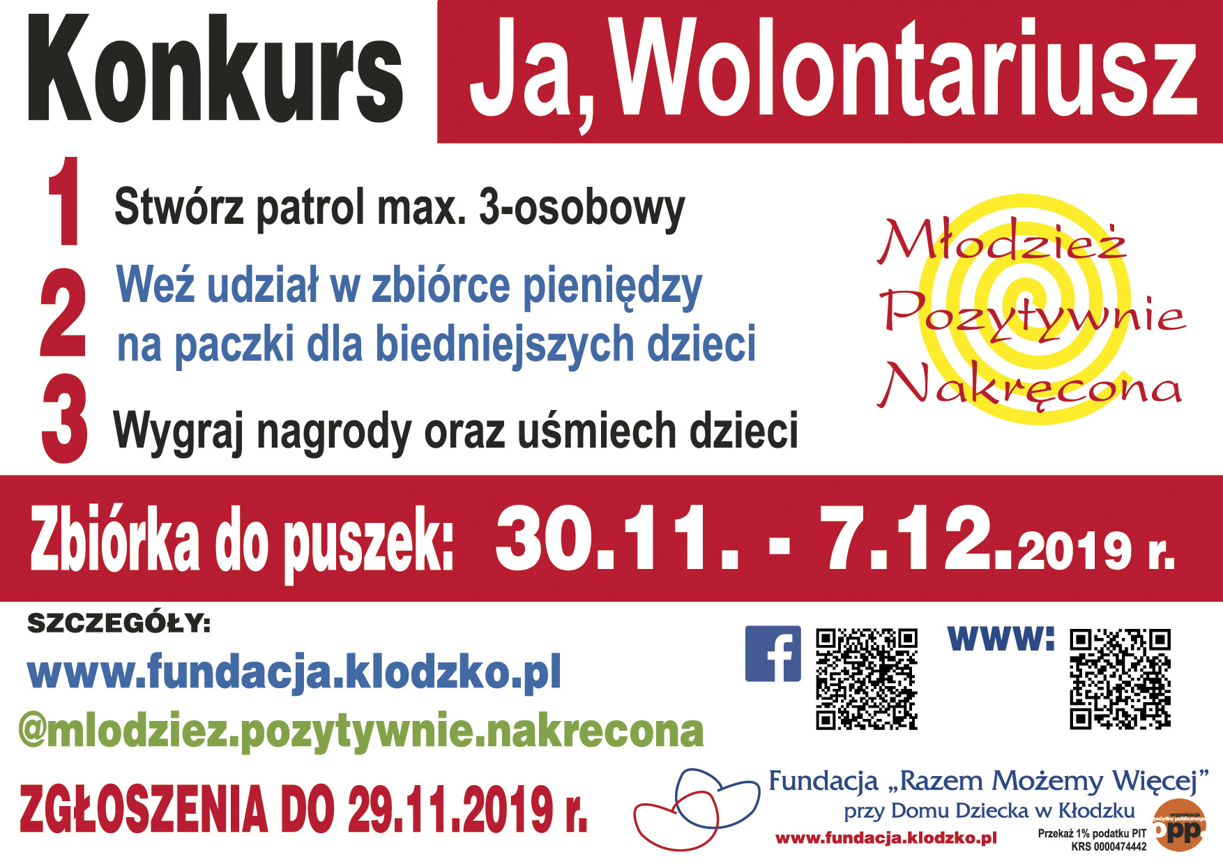 Zgłoszenia patroli tylko do 29.11. Regulamin Konkursu "Ja, Wolontariusz" (pdf) Formularz zgłoszenia (doc) Formularz zgłoszenia (pdf) Formularz RODO (pdf)