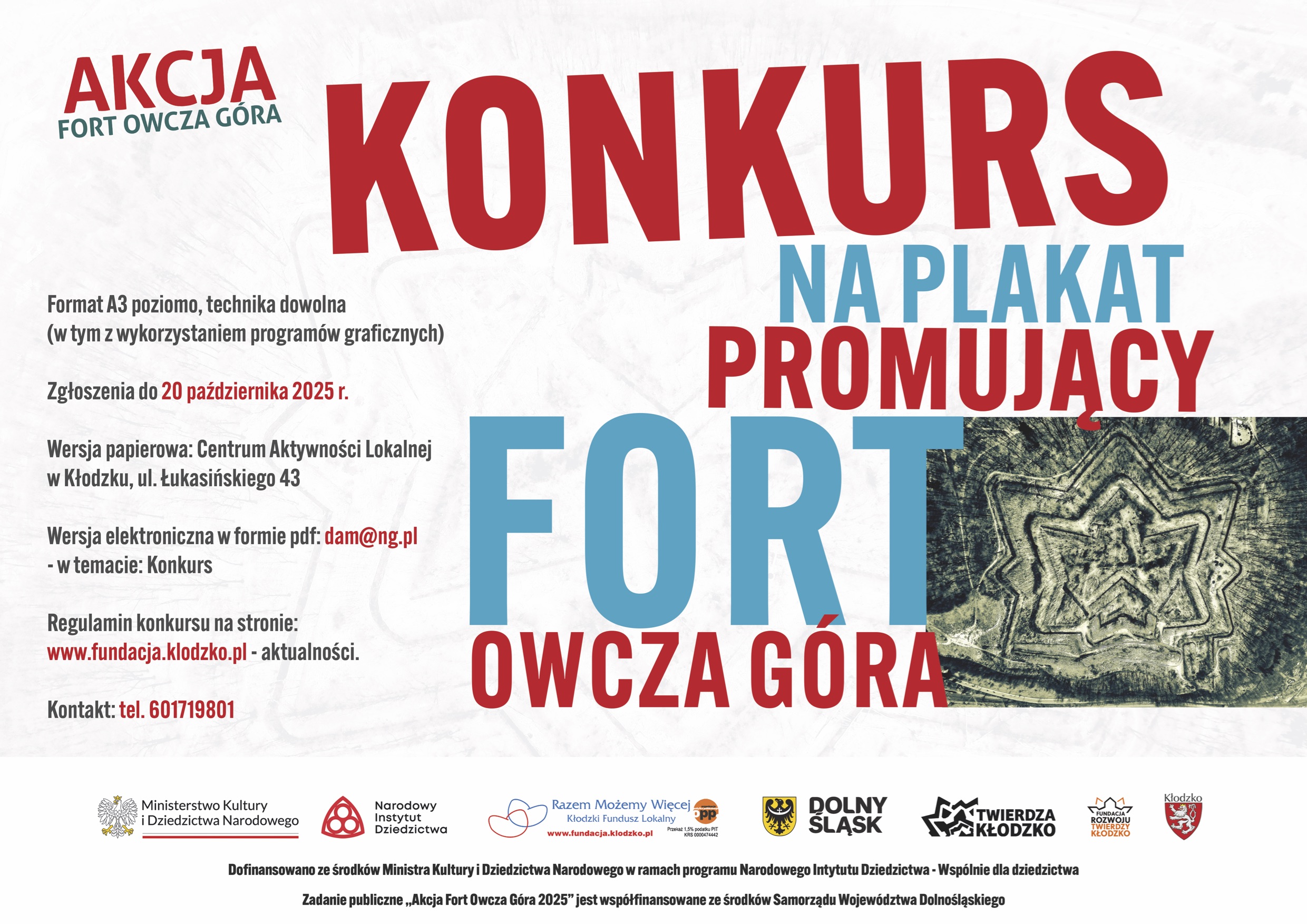 Konkurs jest realizowanych w ramach projektu Akcja Fort Owcza Góra 2025 dofinansowanego ze środków Ministra Kultury i Dziedzictwa Narodowego w ramach programu Narodowego Instytutu Dziedzictwa – Wspólnie dla dziedzictwa oraz ze środków Samorządy Województwa Dolnośląskiego.