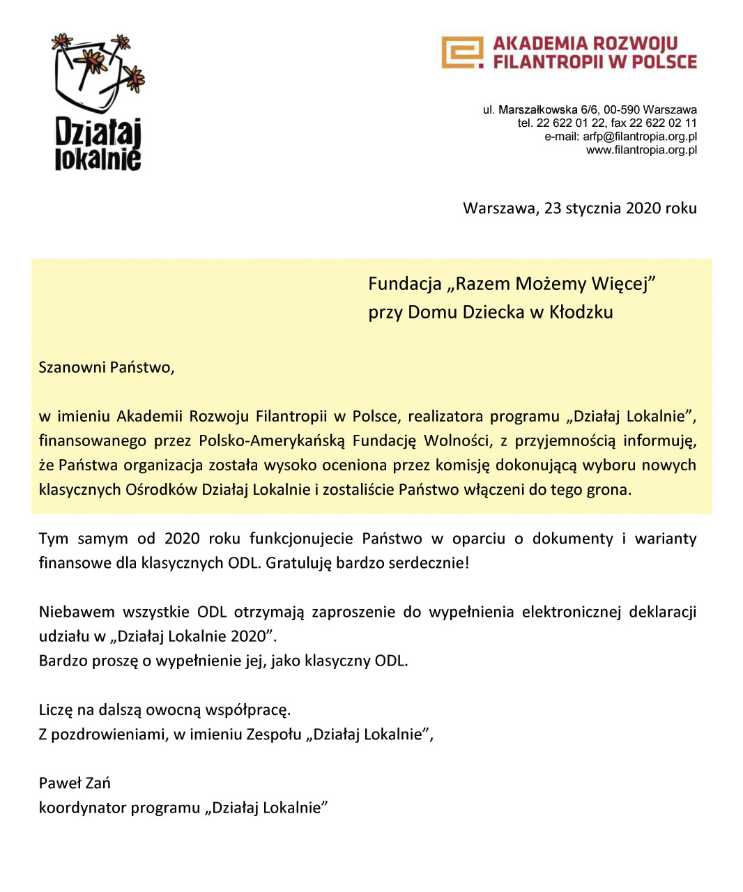 Dzisiaj otrzymaliśmy wspaniałą wiadomość, że staliśmy się klasycznym Ośrodkiem Działaj Lokalnie i będziemy mogli organizować Konkursy Grantowe w ramach Programu "Działaj Lokalnie" Polsko-Amerykańskiej Fundacji Wolności realizowany przez Akademię Rozwoju Filantropii w Polsce i nasz ODL z grantami do 6.000 zł na działania od 3 do 6 miesięcy (dotychczas można było otrzymać granty do 3.000 zł). Przewidujemy w tym roku pulę ponad 55.000 zł.