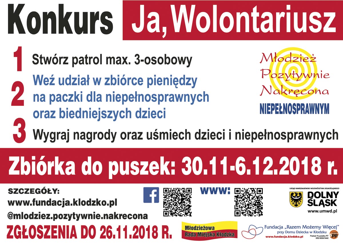 Zgłoszenia patroli tylko do 26.11. Regulamin Konkursu "Ja, Wolontariusz" (pdf) Formularz zgłoszenia (doc) Formularz zgłoszenia (pdf) Formularz RODO (pdf)